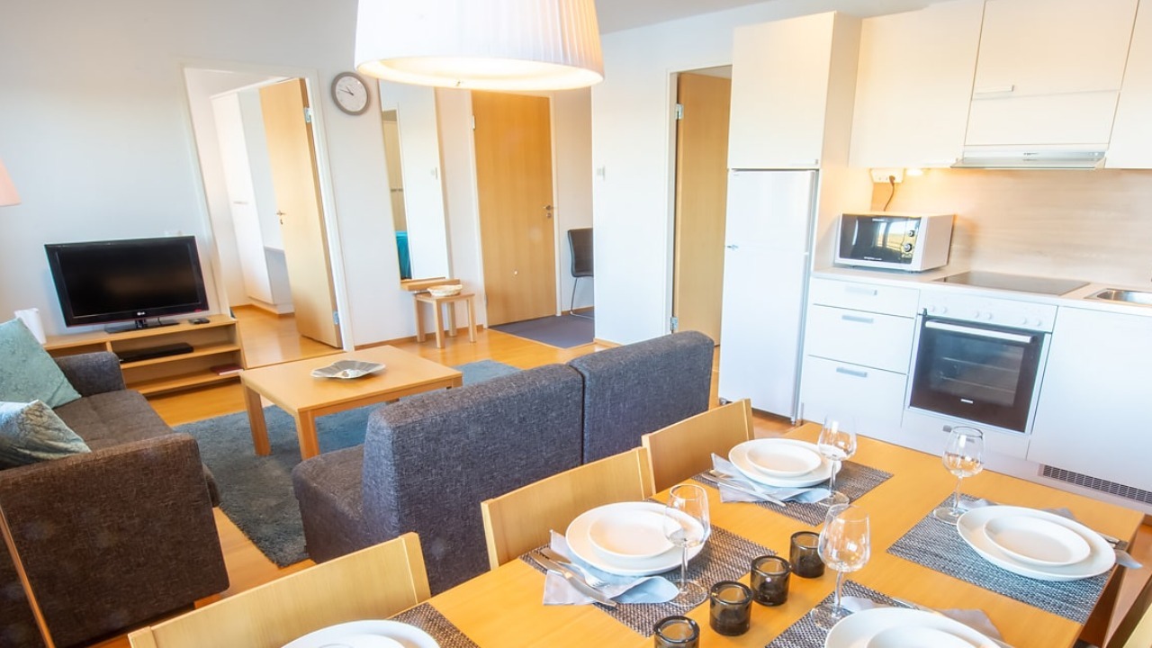 Runsas buffet-aamiainen, liinavaatteet, pyyhkeet, loppusiivous sekä kuntosalin käyttö sisältyvät huoneiston hintaan.